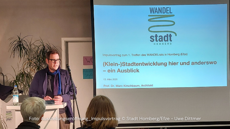 Bei der Betrachtung der Tafeln entwickelte sich schnell eine angeregte Diskussion unter Jugendlichen und Gästen. Im anschließenden Impulsvortrag von Prof. Dr. Marc Kirschbaum, Professor für Geschichte, Theorie und Zukunft von Architektur und Stadt sowie Entwerfen an der SRH Hochschule Heidelberg, über das Thema „Kleinstadtentwicklung – ein Ausblick – hier und anderswo“ sprach er über die Rahmenbedingungen, Voraussetzungen und Aktionen, derer es bedarf, um eine Kleinstadt zukunftsfähig zu entwickeln. Er machte seinen Zuhörerinnen und Zuhörern Mut: „Es braucht gute öffentliche, funktionierende Räume und Homberg hat gute Stadträume, das ist ein Pfund, mit dem diese Stadt wuchern kann. Wir brauchen in Homberg nur mehr Menschen als Fußgänger auf den Straßen und keine Autos.“