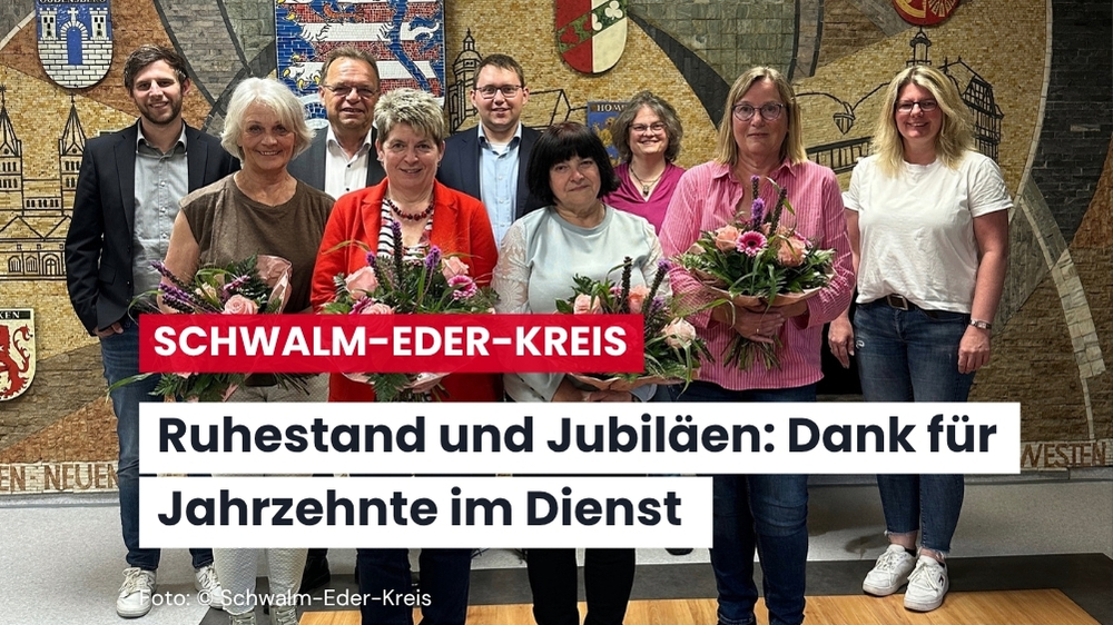 Schwalm-Eder-Kreis, Mai 2025 – In einer kleinen Feierstunde ehrte Landrat Winfried Becker kürzlich mehrere Mitarbeiterinnen der Kreisverwaltung für ihre langjährige Dienstzeit. Zwei Kolleginnen wurden in den Ruhestand verabschiedet, zudem wurden ein 25- und ein 40-jähriges Dienstjubiläum gefeiert.