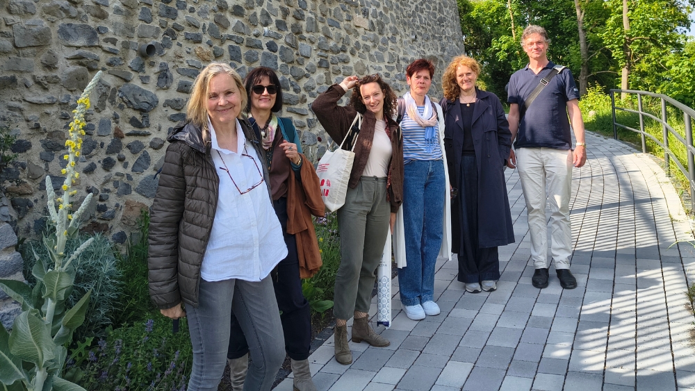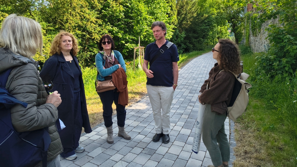 Die Städte haben aufgrund ihrer ähnlichen Struktur, Größe und den vorhandenen Herausforderungen ein gemeinsames Interesse an einer Kooperation, sich fachlich auszutauschen und zukünftig gemeinsam aktuelle Themen zu bearbeiten. Dies wurde im ersten Gespräch schnell deutlich. „Ich freue mich auf Inspirationen, wie Sie Ihre Projekte mit Leichtigkeit angehen. Ich bin froh, dass Sie hier sind und eine gute Anreise hatten“, begrüßte Claudia Ulrich ihre Gäste. Nach einer kleinen Stärkung mit Kaffee und Kuchen und belegten Schnittchen ging es auf einen Rundgang durch die Stadt. Fachbereichsleiter Markus Staedt und Klimaschutzmanagerin Christiane Voith zeigten ihren italienischen Gästen die Orte des Wandels und stellten die Ergebnisse aktueller Förderprogramme anhand laufender Projekte vor Ort vor, wie zum Beispiel das Haus der Geschichte, die neue Platzgestaltung am Multifunktionshaus M 15 und das Haus selbst (Bundesprogramm Sanierung kommunaler Einrichtungen in den Bereichen Jugend, Sport, Kultur), die Nahwärmezentrale in der Kreuzgasse, den Altstadt-Kindergarten, den neuen Spazierweg an der Stadtmauer und die Fachwerkerei.