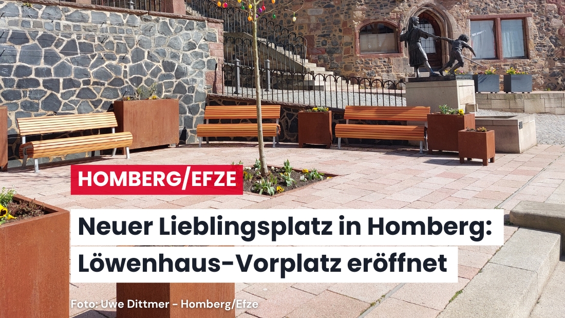 Damit die Besucherinnen und Besucher ihren Aufenthalt am Homberger Marktplatz und die Atmosphäre des Fachwerkambientes genießen können, gibt es eine neue Platzgestaltung. Sie haben jetzt neben den Aufenthaltsmöglichkeiten in den gastronomischen Betrieben die Möglichkeit, sich auf dem Vorplatz an der Pferdetränke direkt, vor dem Löwenhaus, aufzuhalten. Fünf Bänke und zahlreiche Blumenkübel mit frischen Frühlingsblühern und einem Baum laden zum Verweilen ein. Das ist neben dem Platz an der Engen Gasse der zweite neue Verweilort in Marktplatznähe, den die Stadt Homberg (Efze) dank des Förderprogramms „Zukunft Innenstadt“ für ihre Bürgerinnen und Bürger gestaltet hat.