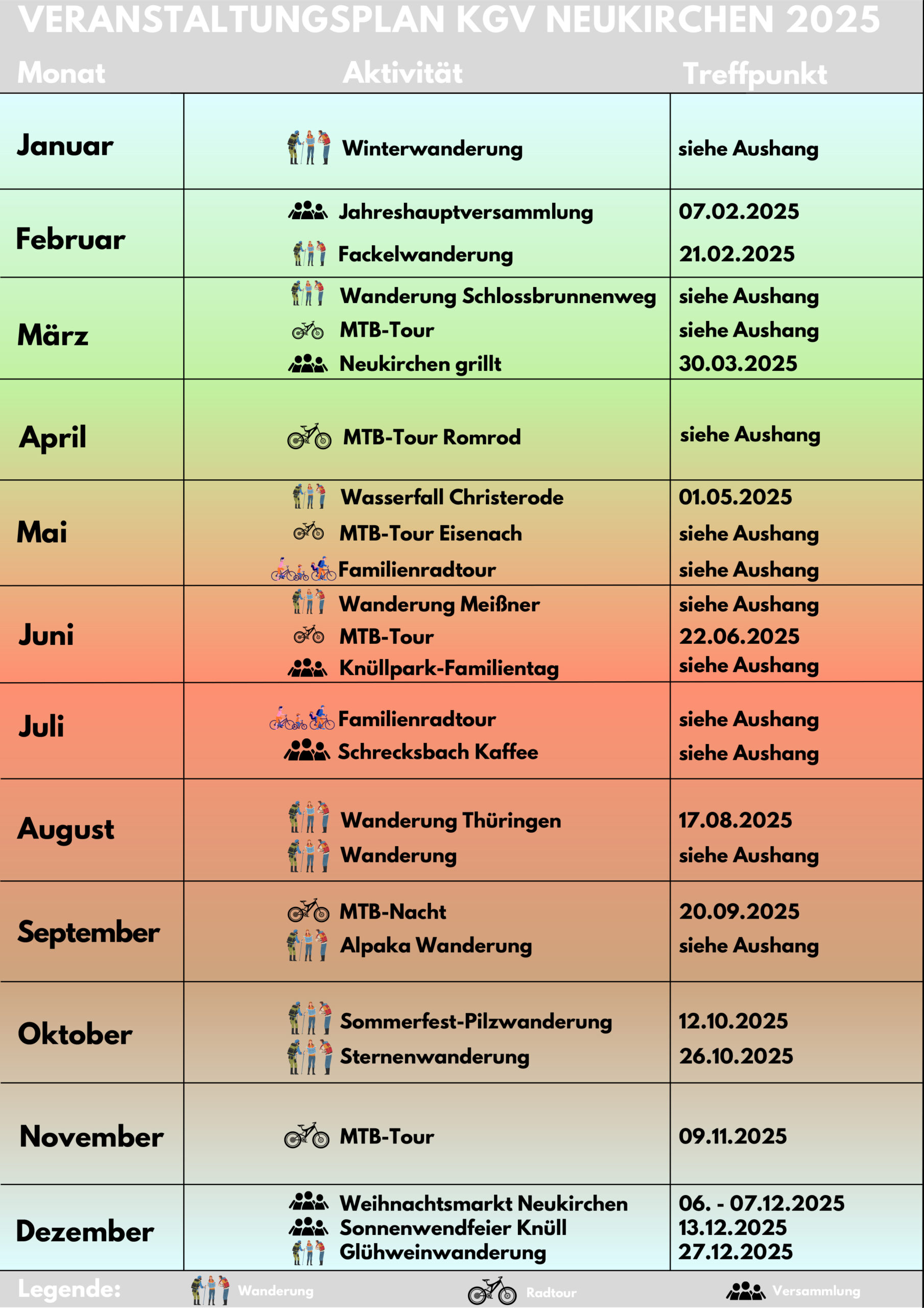 Neben der Jahreshauptversammlung erwartet die Mitglieder ein abwechslungsreicher Veranstaltungsplan mit Wanderungen, Radtouren und geselligen Treffen. Hier eine Übersicht der wichtigsten Termine: