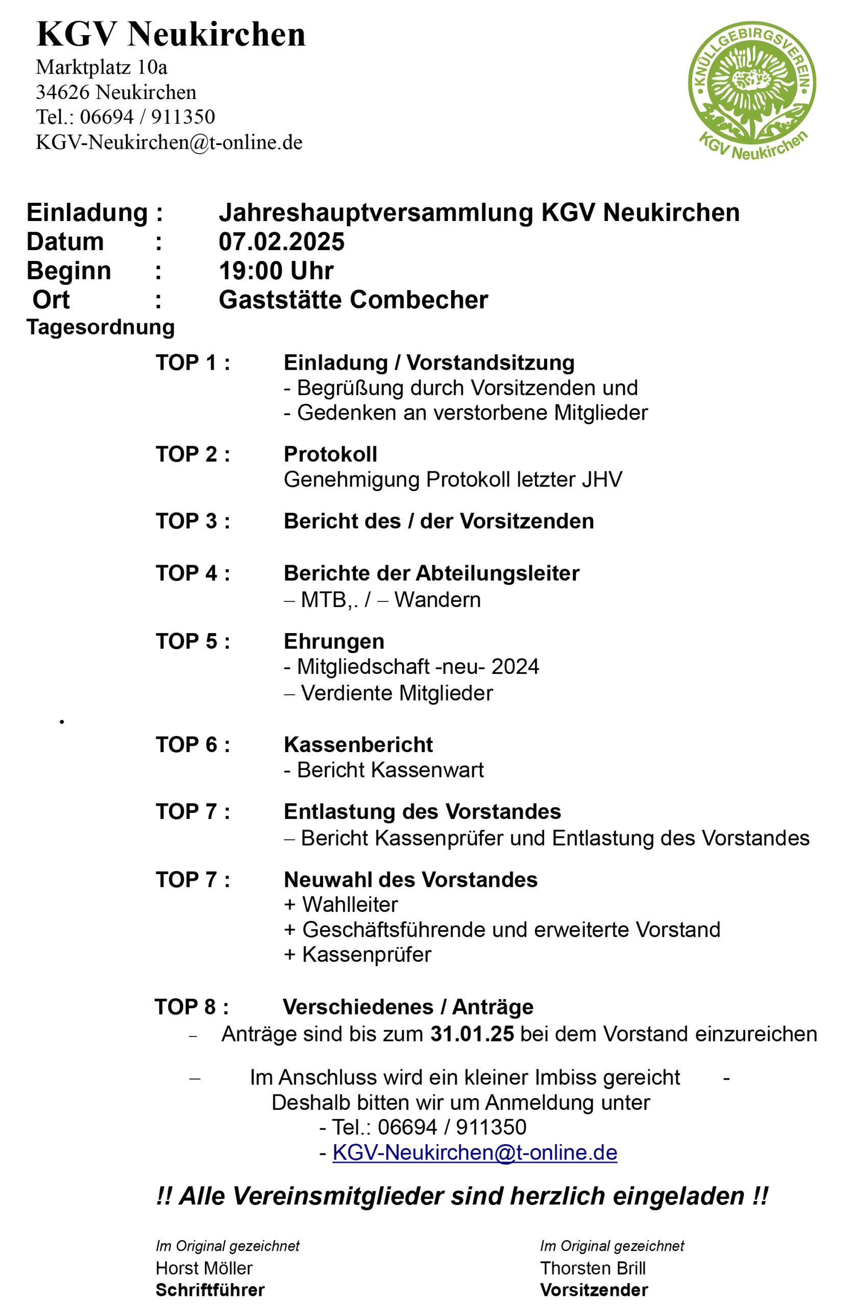 Neukirchen. Der Knüllgebirgsverein (KGV) Neukirchen lädt alle Mitglieder herzlich zur Jahreshauptversammlung am Freitag, den 07. Februar 2025, um 19:00 Uhr in der Gaststätte Combecher ein.
