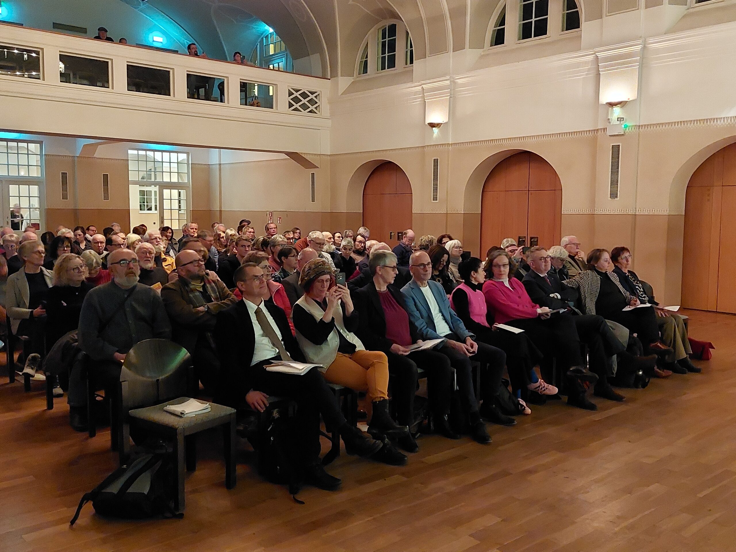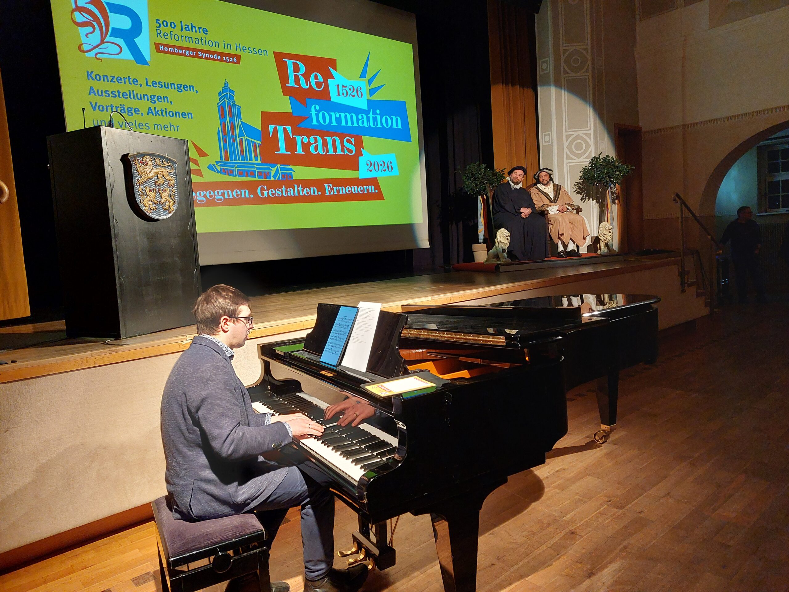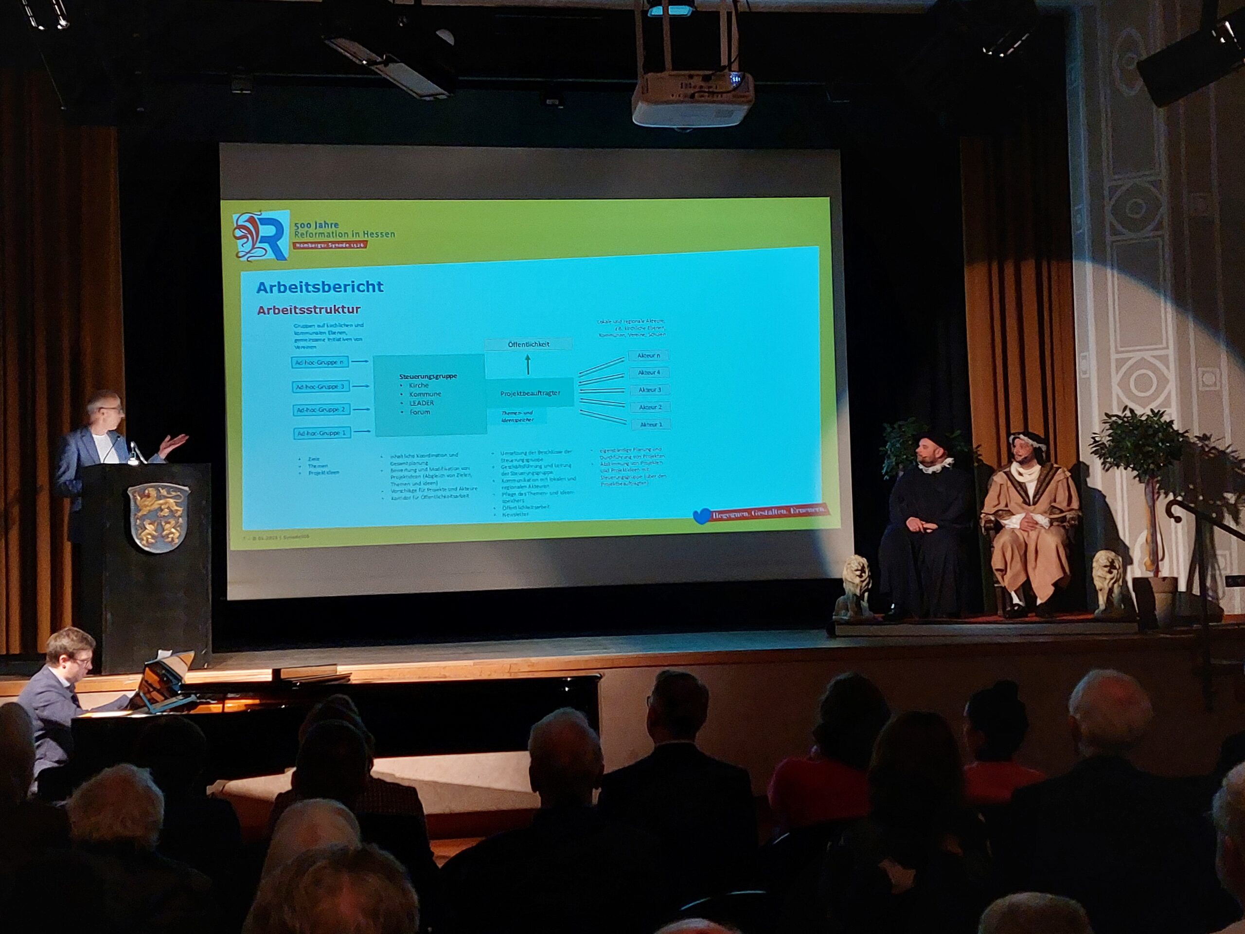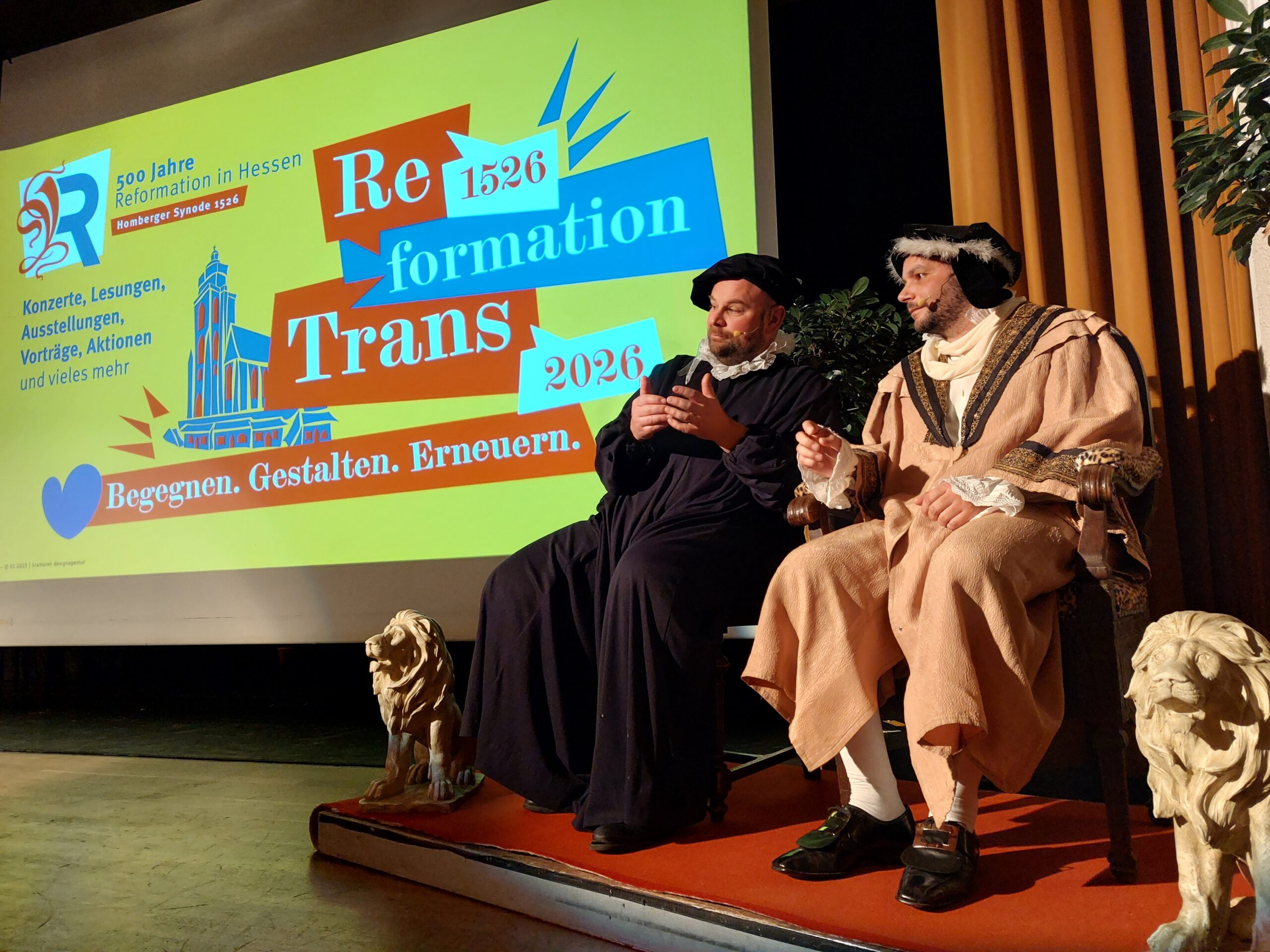 Zur Information über die bisherigen Planungen zum Jubiläumsjahr und für den Austausch untereinander trafen sich am 30. Januar 2025, um 18:30 Uhr, Akteure und Interessierte zu einer Auftakt- und Informationsveranstaltung in der Homberger Stadthalle. Zur großen Überraschung aller Besucher trat auch Landgraf Philipp selbst auf. In Begleitung von Adam Krafft kommentierten beide den einen oder anderen Beitrag. Selbstverständlich handelte es sich dabei nicht um die historischen Personen, sondern um Akteure der Kleinen Bühne Schwalm-Eder. Sie wiesen so auf die erneute Aufführung ihres „Synoden-Schauspiels“ hin, das im kommenden Jahr wieder in der Reformationskirche zur Aufführung kommt.