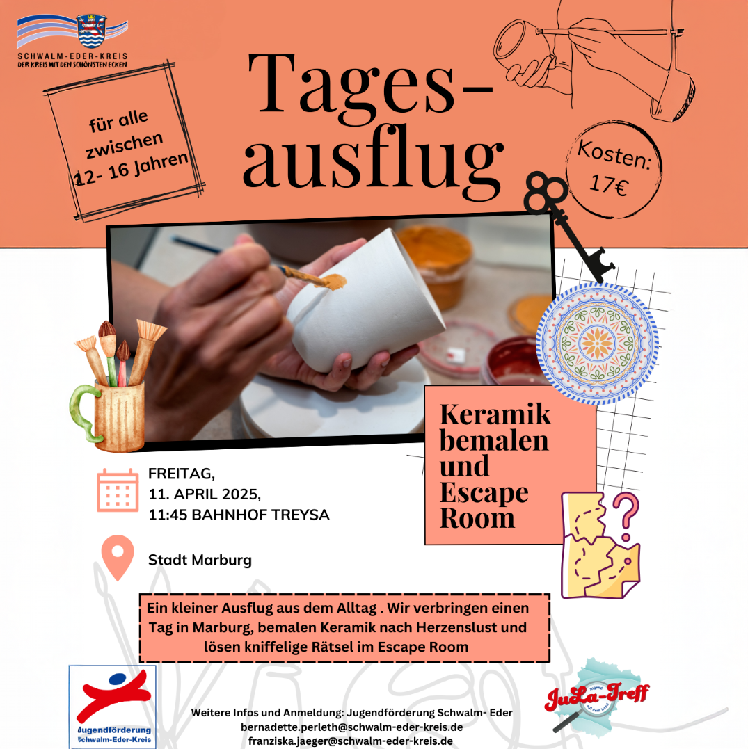 Die Jugendförderung Schwalm-Eder und der JuLa-Treff (Jugend auf dem Land; Oberaula, Ottrau, Schwarzenborn) laden alle Jugendlichen im Alter von 12 bis 16 Jahren zu einem spannenden Tagesausflug nach Marburg am 11. April ein. Hier erwartet die Teilnehmenden ein abwechslungsreiches Programm, das Kreativität, Teamgeist und Rätselspaß vereint.