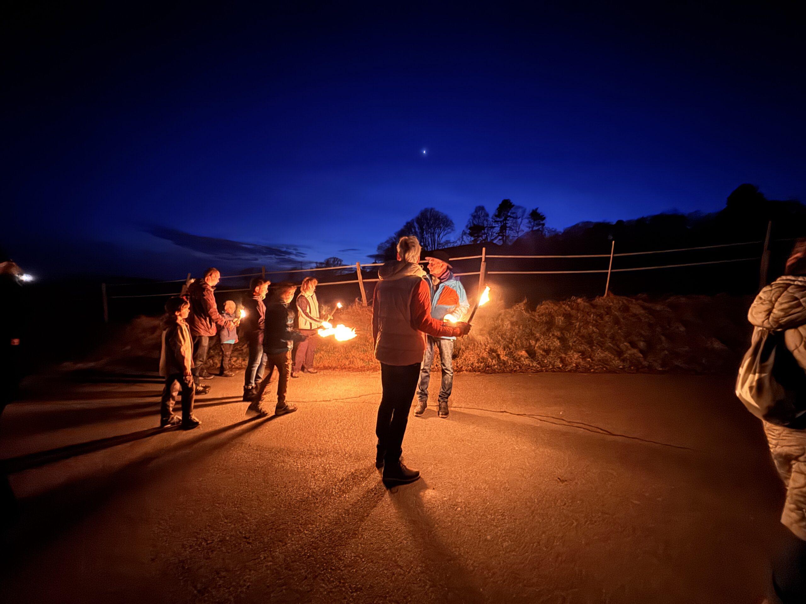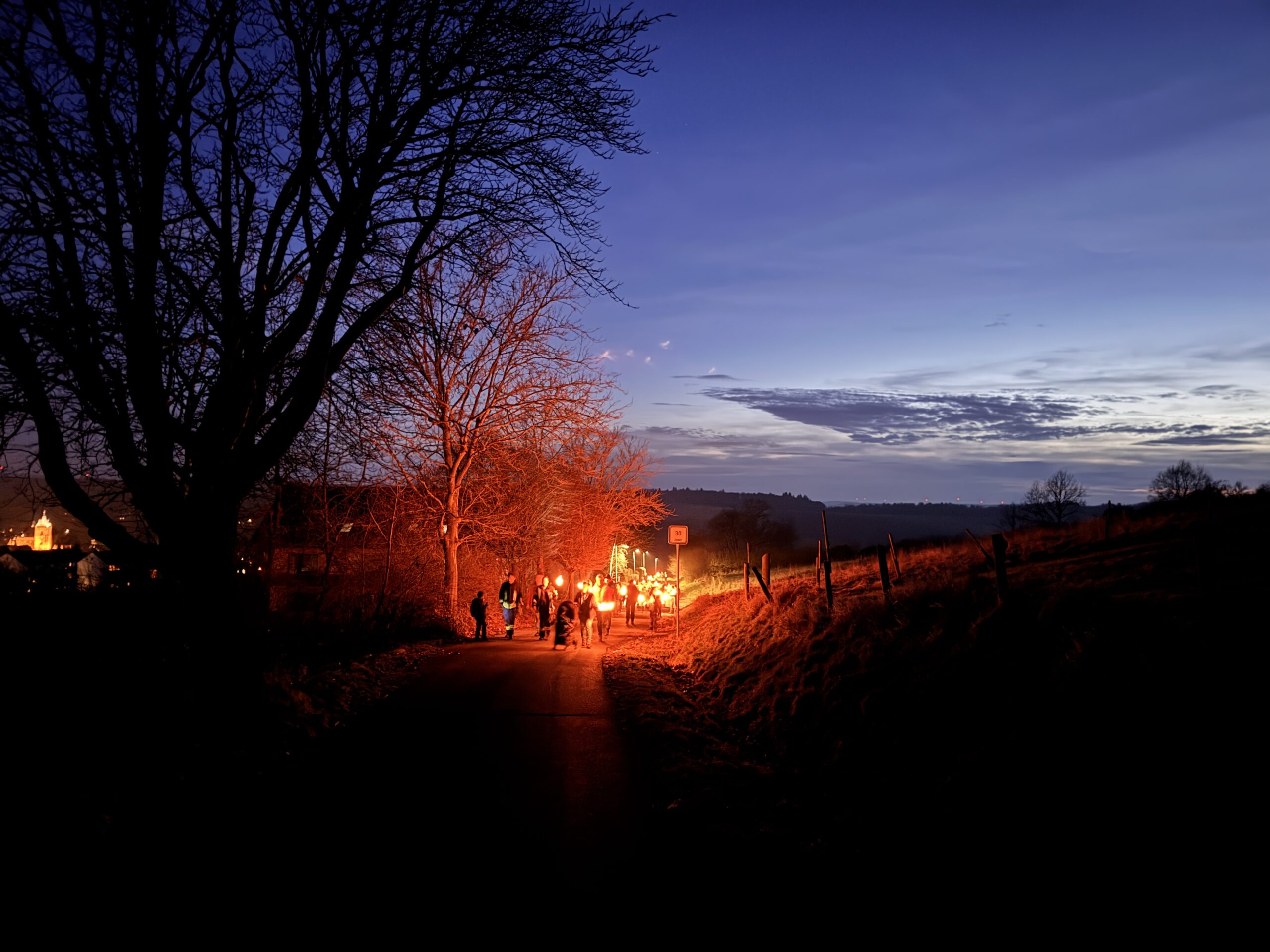 Mit Einbruch der Dämmerung setzte sich die Wandergruppe in Bewegung. Der Weg führte zunächst durch die Stadt und weiter entlang des Wanderwegs „Nuff und Noop“. Am Ortsrand angekommen, wurden die Fackeln entzündet, wodurch sich ein faszinierendes Lichterspiel ergab. Ziel der Wanderung war die Eichwaldhütte, wo das lodernde Biikefeuer bereits wartete und die Teilnehmer in Empfang nahm.
