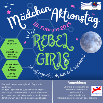 Schwalm-Eder-Kreis – Am 15. Februar 2025 öffnet der Mädchenaktionstag des Schwalm-Eder-Kreises seine Türen und lädt Mädchen ab der 5. Klasse zu einem unvergesslichen Erlebnis auf das Gelände von anorak21 e.V. ein. Unter dem Motto „Rebel Girls – Sei außergewöhnlich, lass dich inspirieren!“ steht der Tag ganz im Zeichen von Selbstbewusstsein, Kreativität und Gemeinschaft.