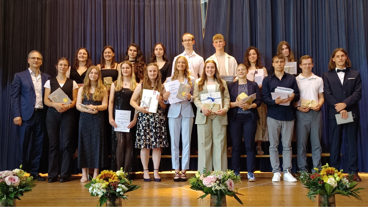 Das Foto mit der großen Gruppe zeigt den gesamten Abiturjahrgang. Das Bild mit der kleineren Gruppe zeigt Schulleiter Mario Cimiotti mit den Geehrten (Namen s.o.). Auf beiden Fotos fehlt Hannah Busch.
