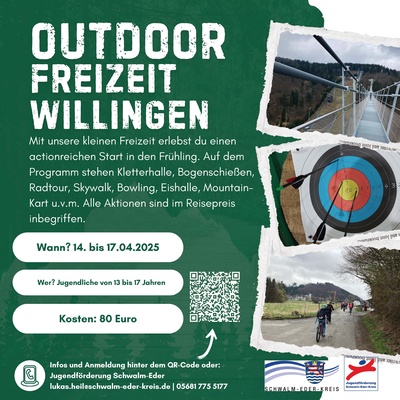 Die Jugendförderung des Schwalm-Eder-Kreises lädt Jugendliche im Alter von 13 bis 17 Jahren zu einer spannenden Outdoorfreizeit in Willingen ein. Vom 14. bis 17. April 2025 erwartet die Teilnehmer ein abwechslungsreiches Programm voller Action und Spaß.