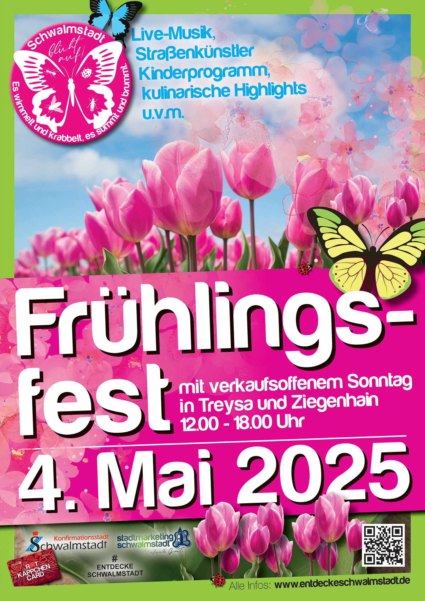 Schwalmstadt – Am Sonntag, den 4. Mai 2025, lädt Schwalmstadt erneut zum Frühlingsfest mit verkaufsoffenem Sonntag in die Stadtteile Treysa und Ziegenhain ein. In diesem Jahr steht das Fest ganz im Zeichen der Natur – unter dem Motto „Schwalmstadt blüht auf – Es wimmelt und krabbelt, es summt und brummt“.